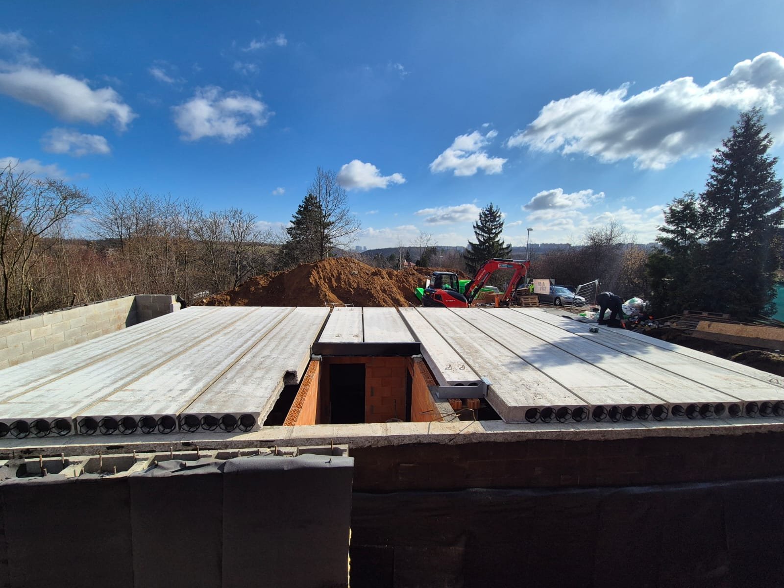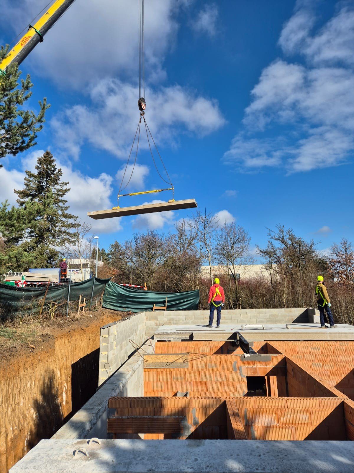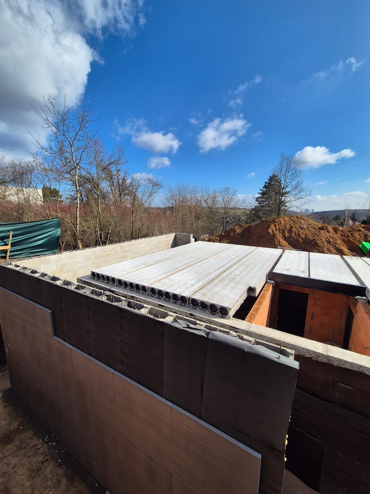 • Technický stav nemovitosti: Technická infrastruktura v místě je kompletní. Veřejné inženýrské sítě – vodovod, kanalizace a zemní plyn – jsou vedeny v přilehlé komunikaci. Elektrická energie je již přivedena přímo na pozemek. Byl zahájeny práce a provedeny základové práce až po uložení panelového stropu podzemního podlaží. Míra rozestavěnosti je 32 %.