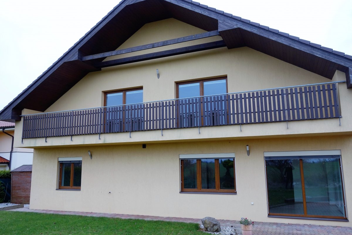 • V 1.NP se nachází zádveří, chodba se schodištěm, šatna, garáž, obývací pokoj s kk, pokoj, technická místnost a ve 2.NP se nachází ložnice, šatna, koupelna a 3 pokoje.